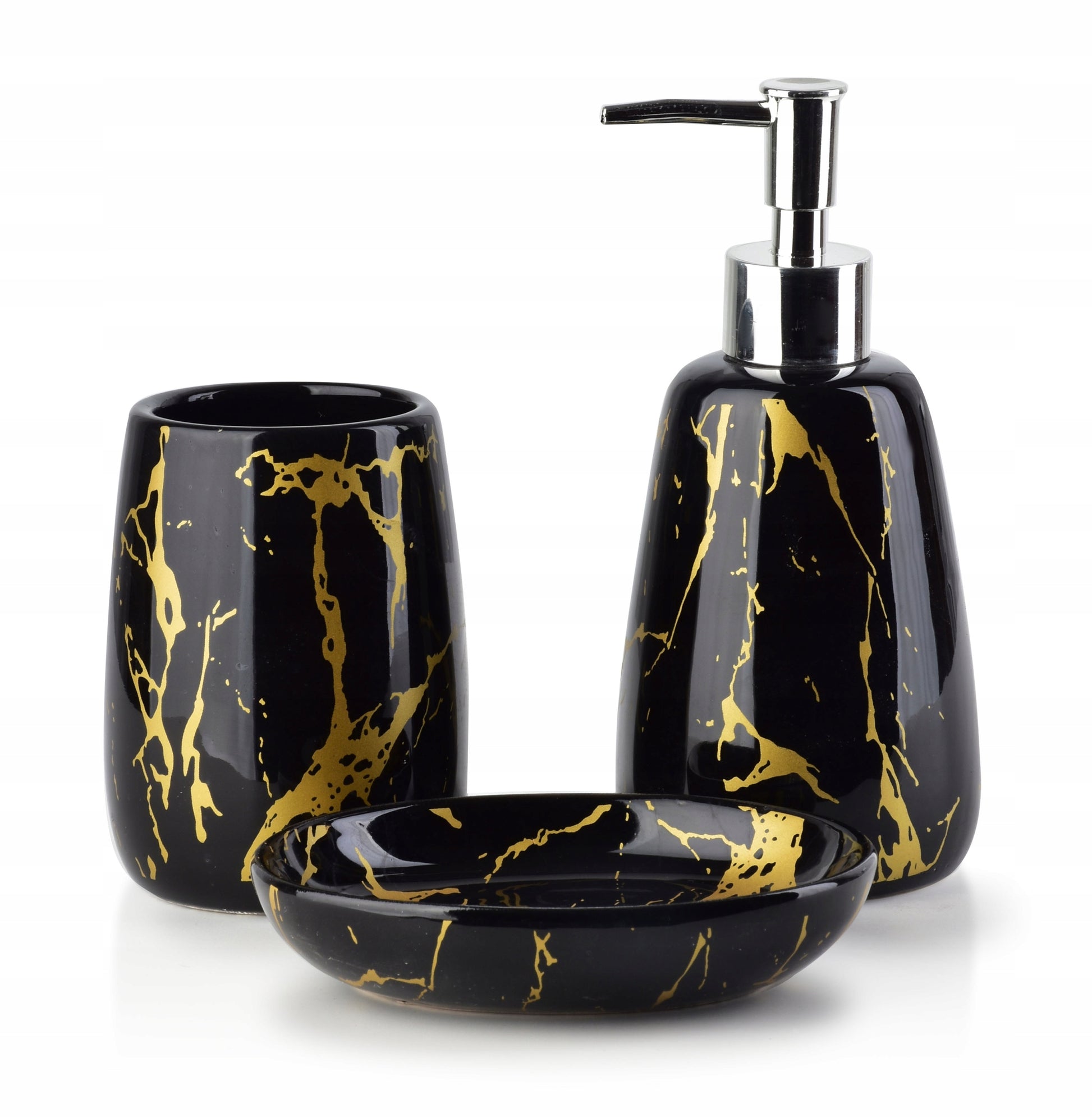 Prabangos pojūtis jūsų vonios kambaryje su šiuo išskirtiniu trijų dalių rinkiniu! Jame yra skysto muilo ar losjono dozatorius, muilinė ir daugiafunkcinis puodelis, puikiai tinkantis šepetėliams, skutimosi reikmenims ar kitiems priedams. Kiekviena dalis pagaminta iš aukštos kokybės keramikos ir papuošta prabangiu auksinio marmuro dizainu, kuris spinduliuoja elegancija. Auksinės gyslos suteikia jūsų vonios kambariui nesenstančio žavesio ir rafinuotumo, sukuriant prabangią, stilingą aplinką. Šis rinkinys – tai ne tik praktiškas sprendimas, bet ir išskirtinis akcentas jūsų interjere.